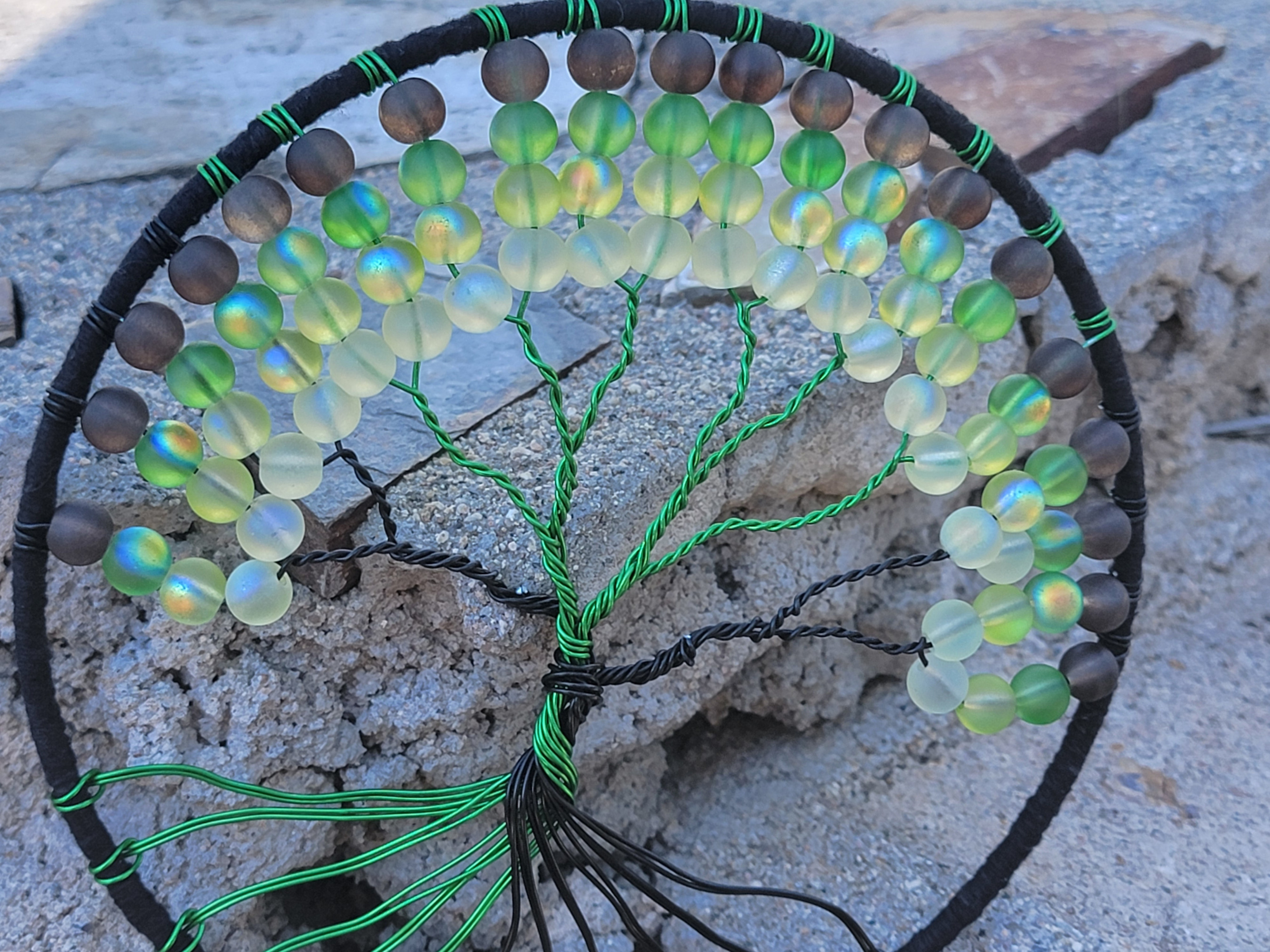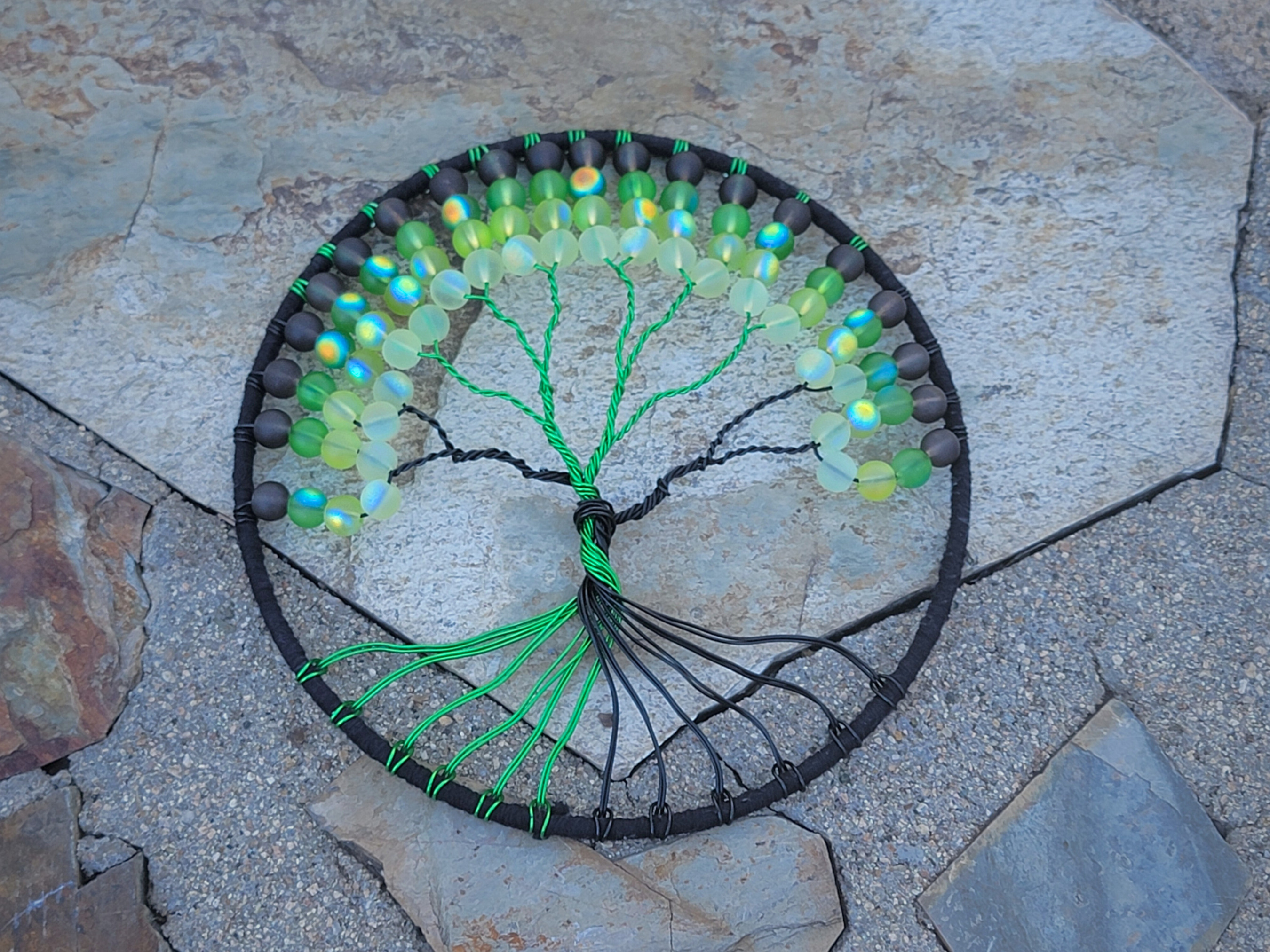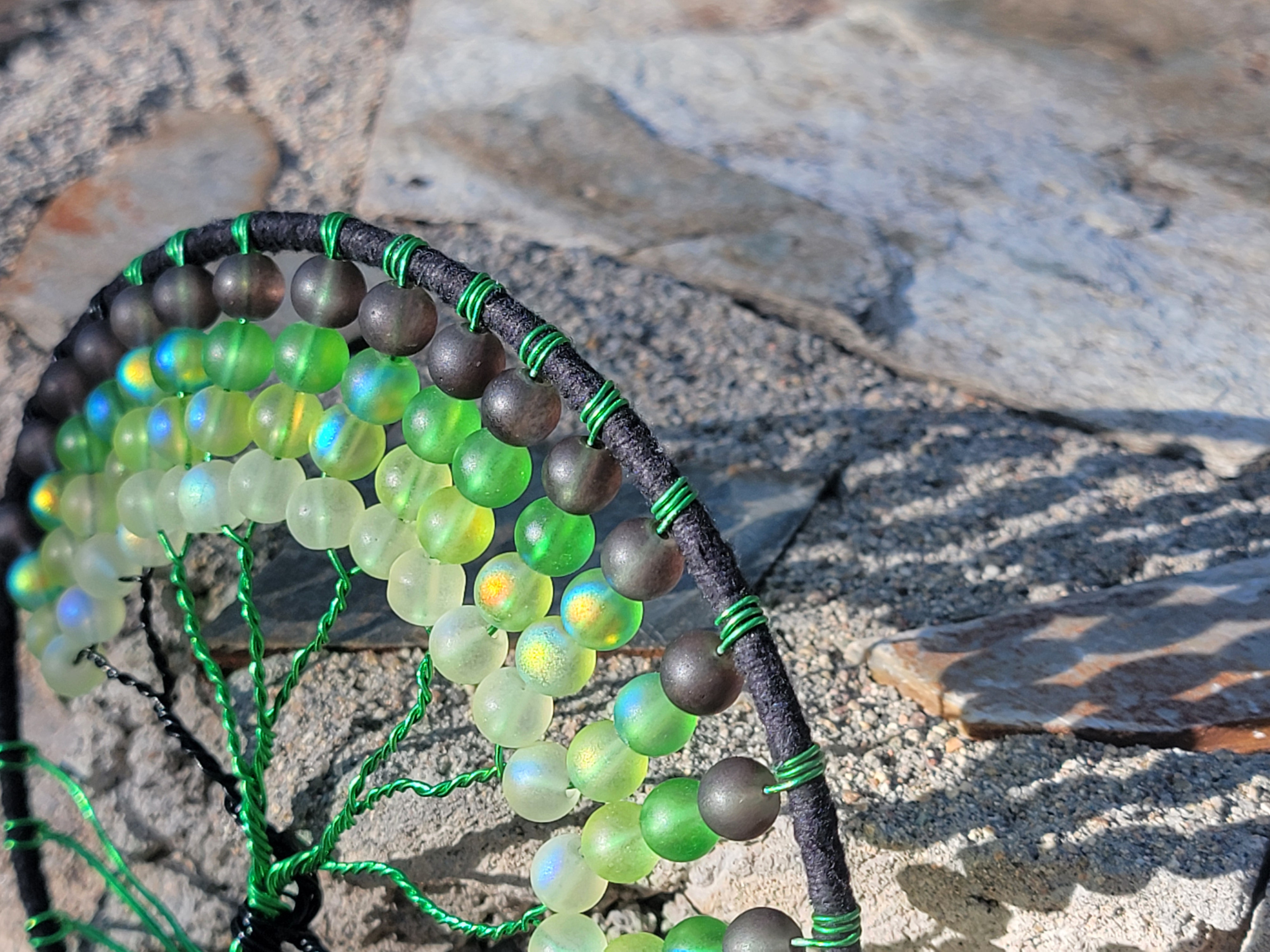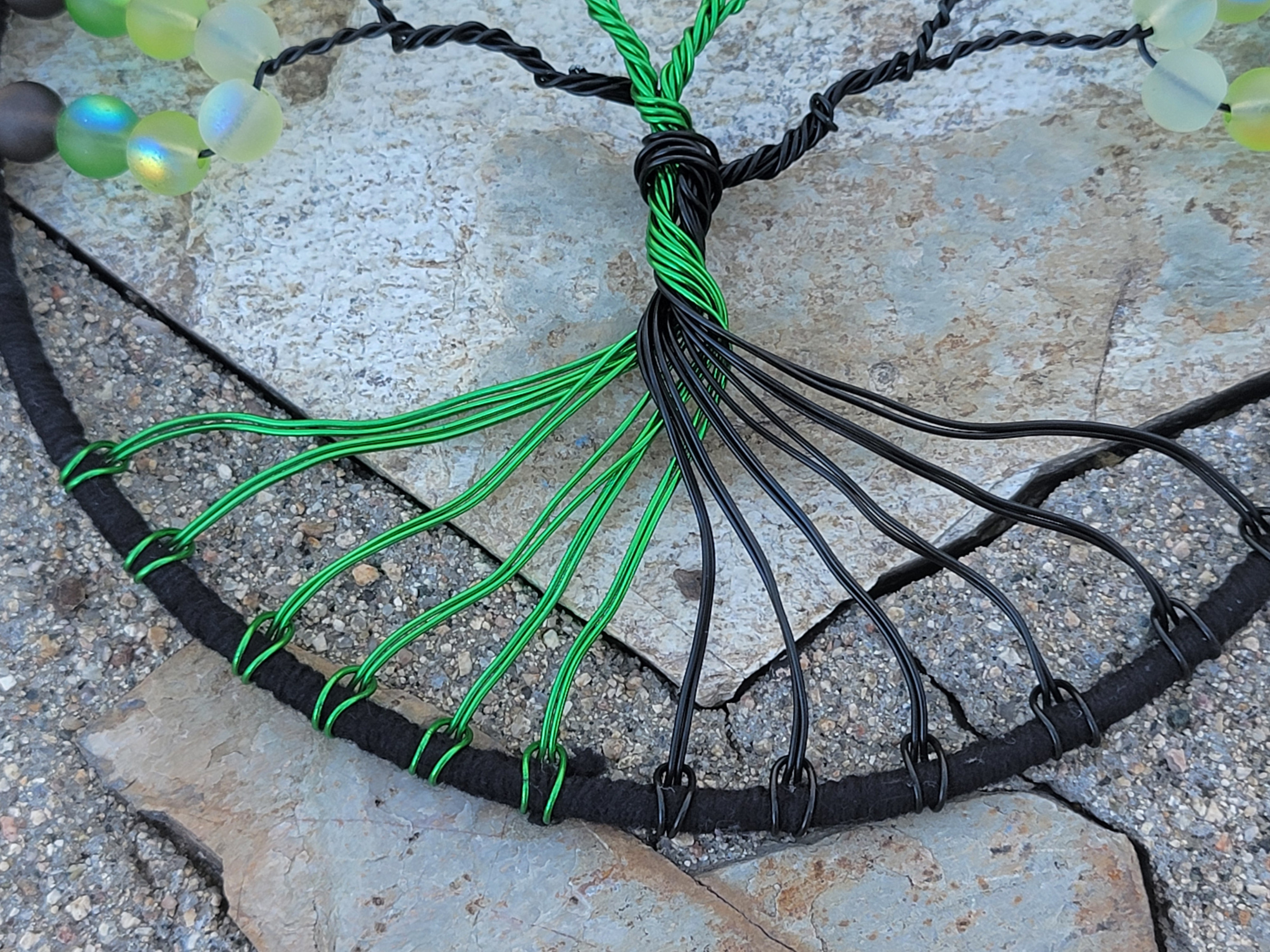 This 6-inch Tree of Life features black wire roots and trunk wrapped in black yarn, accented with glowing green and matte beads for a bold, Halloween-inspired look. A unique suncatcher or wall piece to bring a touch of spooky charm to your space.