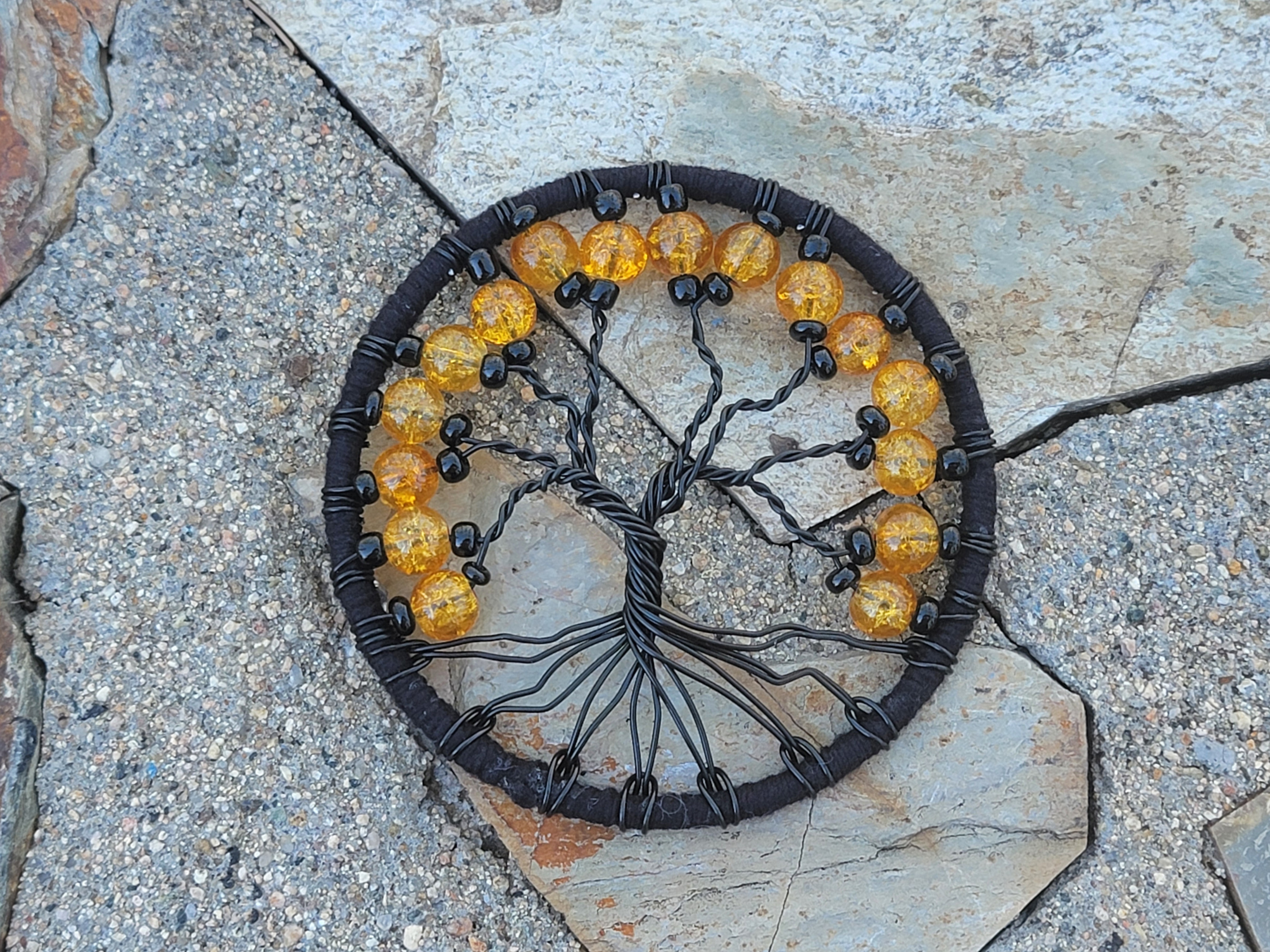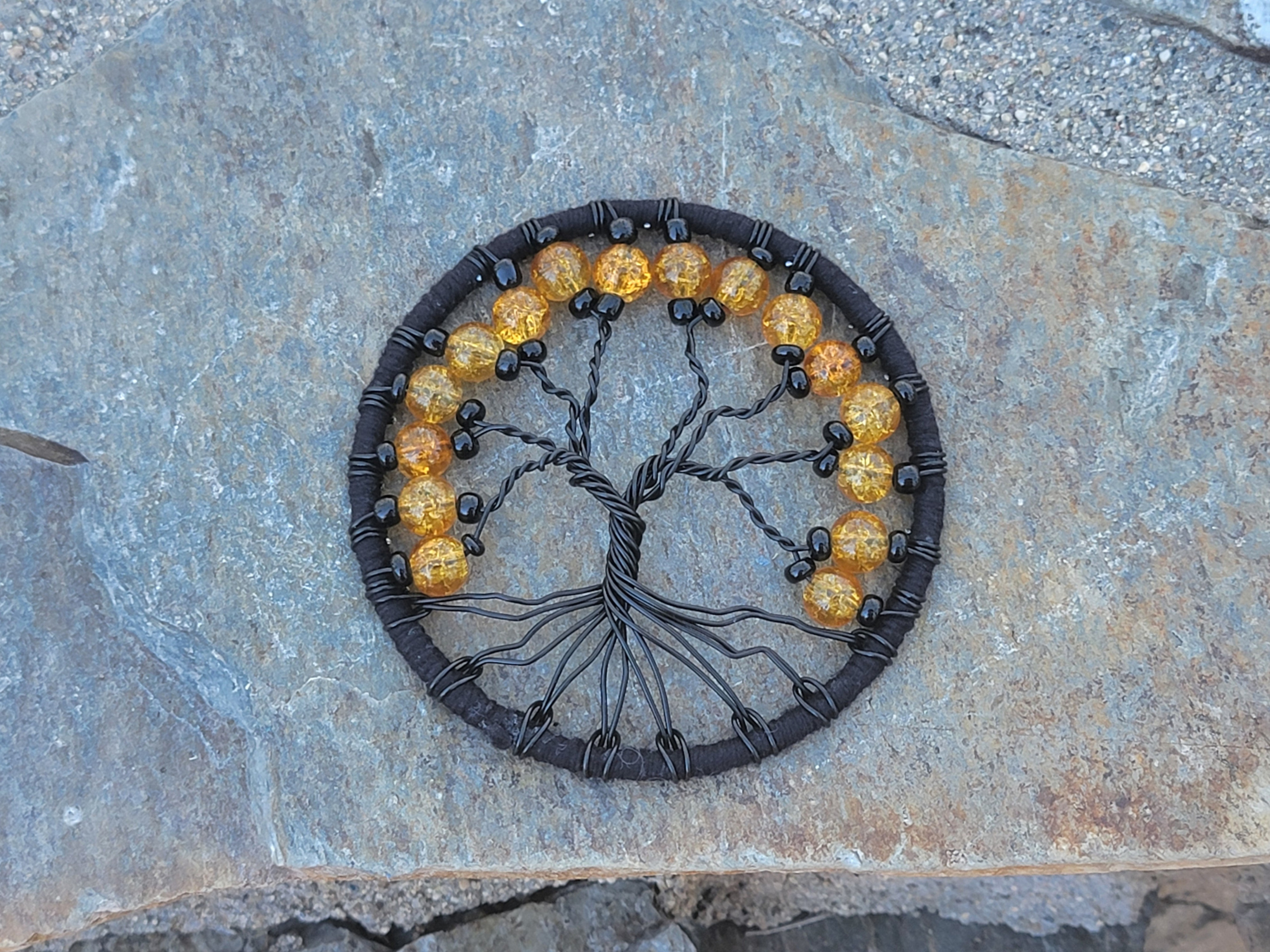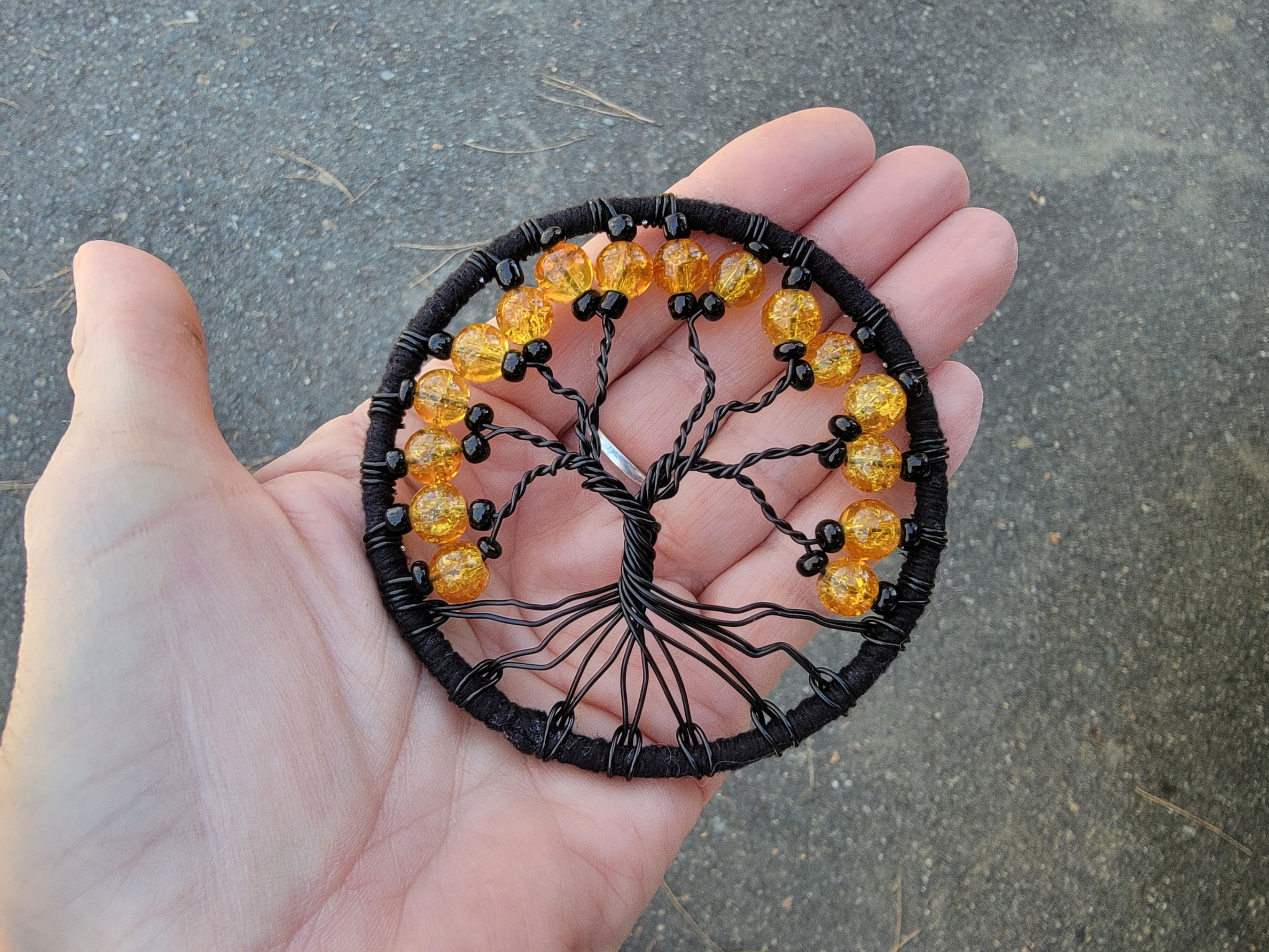 A spooky little beauty for your Halloween décor! This 3-inch Tree of Life features a black yarn-wrapped hoop, twisted black wire branches, black seed bead accents, and glowing orange crackle beads that give it a festive pop. Perfect for adding a touch of Halloween magic to windows, altars, or small spaces.