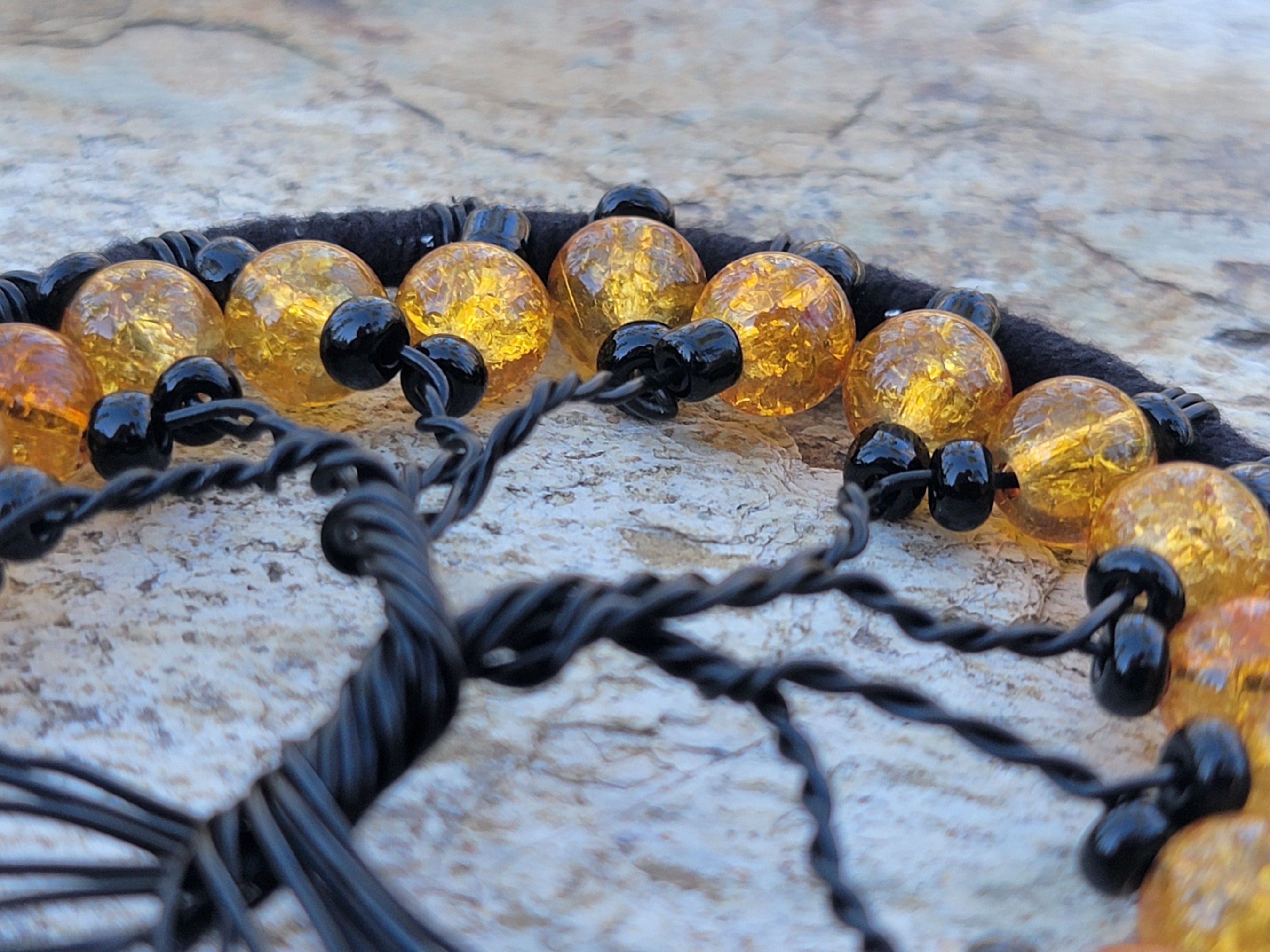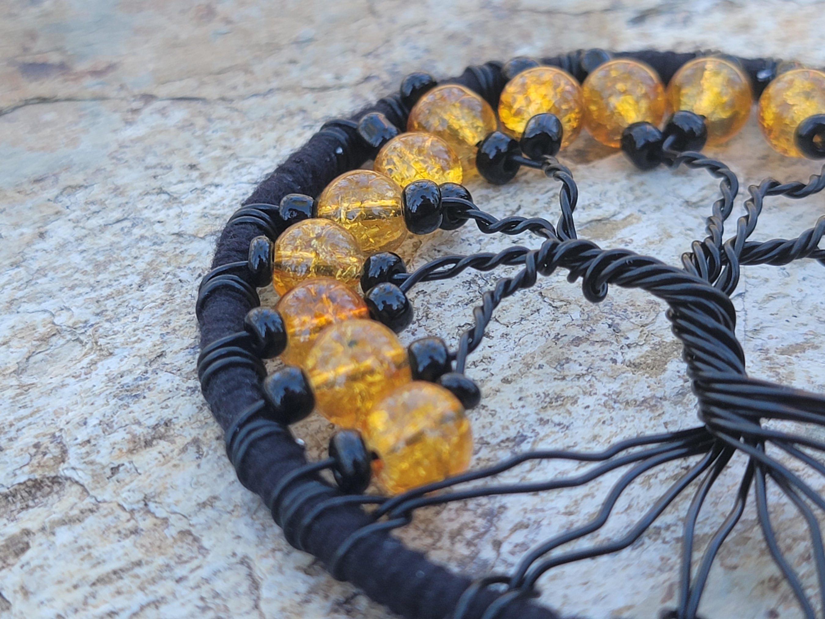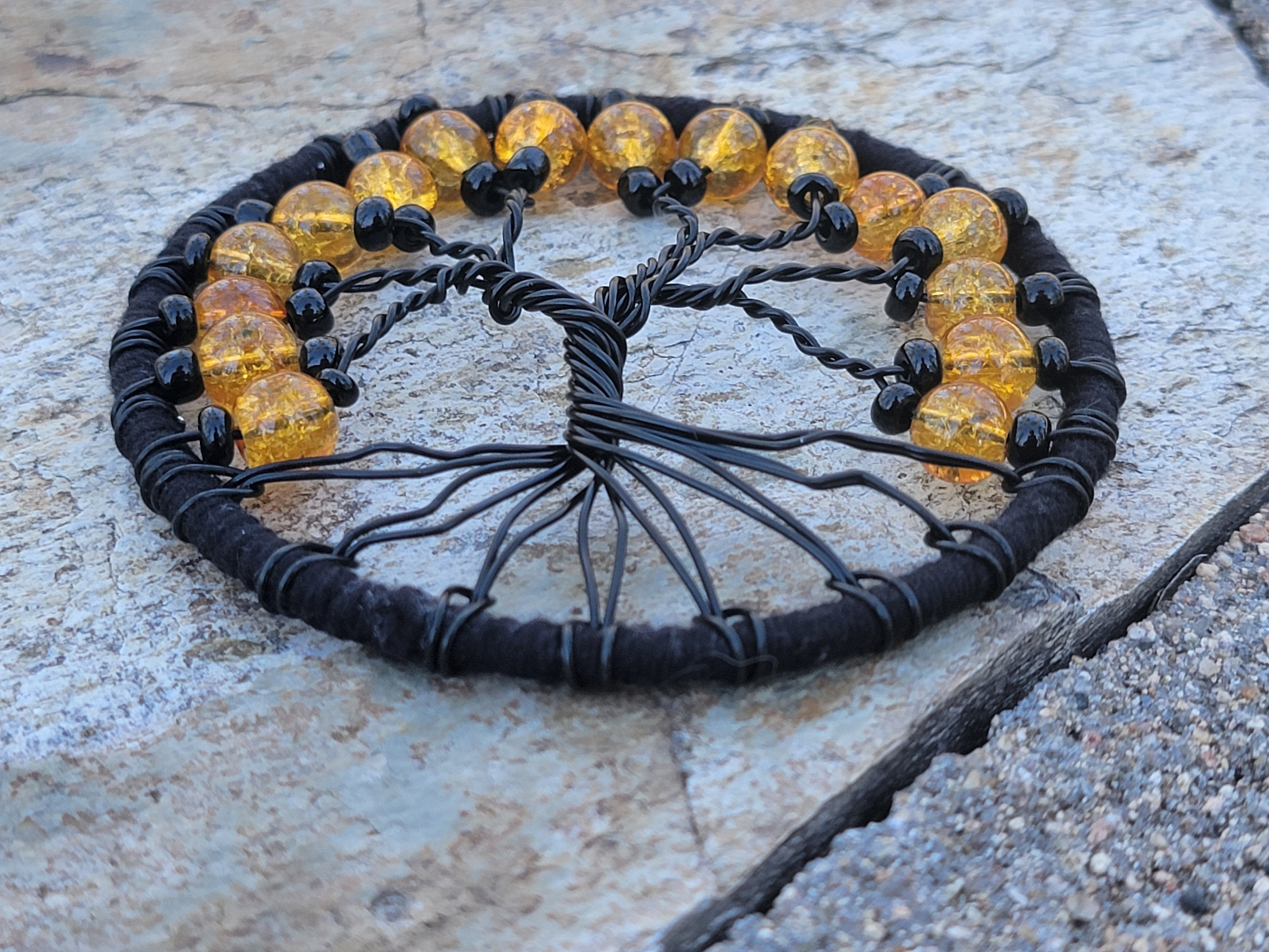 A spooky little beauty for your Halloween décor! This 3-inch Tree of Life features a black yarn-wrapped hoop, twisted black wire branches, black seed bead accents, and glowing orange crackle beads that give it a festive pop. Perfect for adding a touch of Halloween magic to windows, altars, or small spaces.