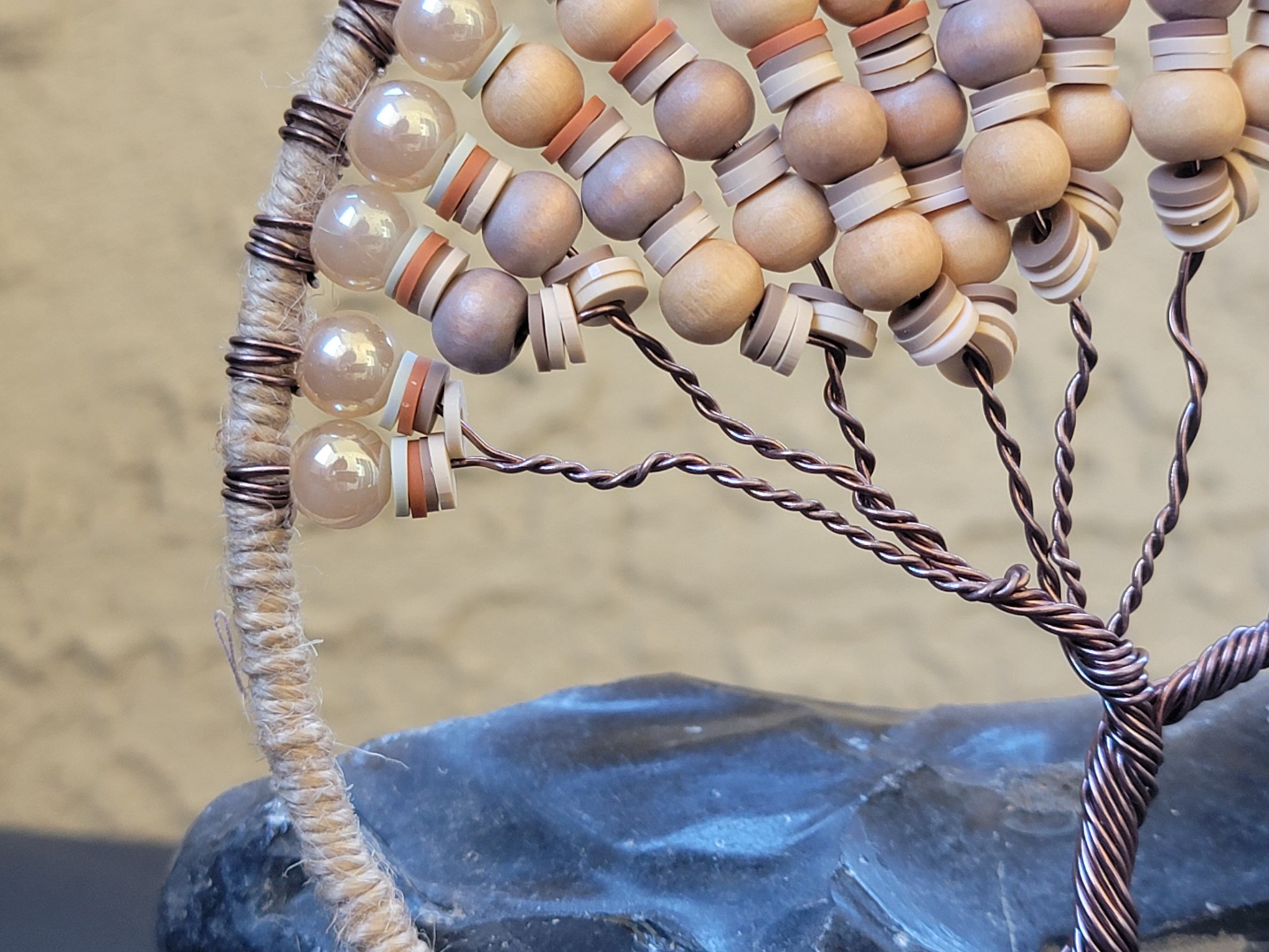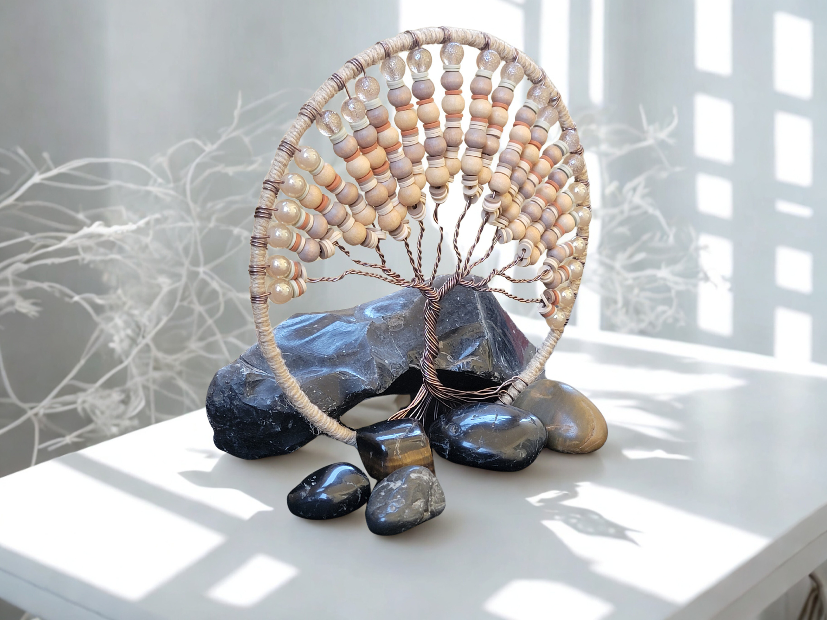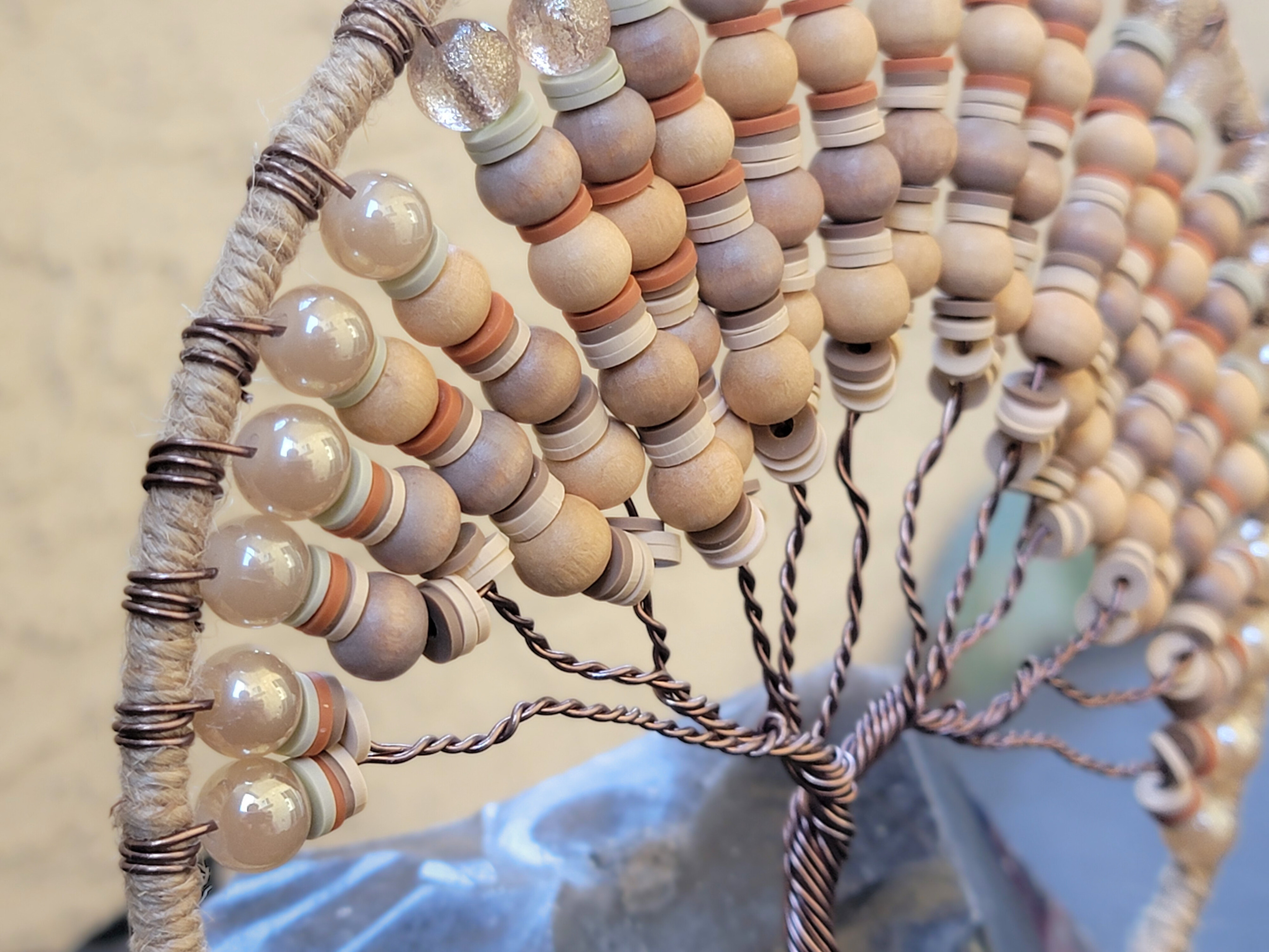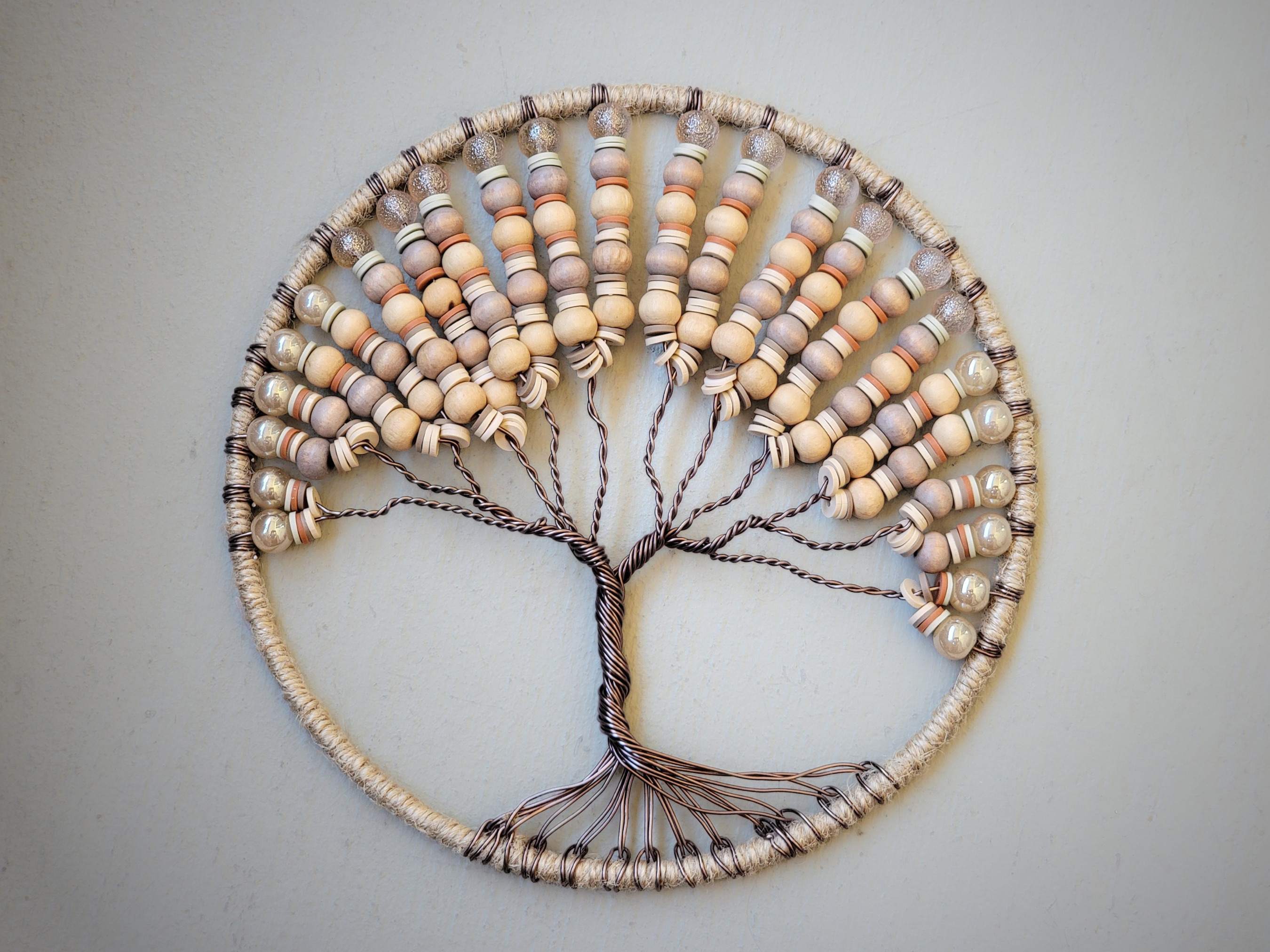 This 6 inch handcrafted Tree of Life wall hanging is made with warm earth-toned wooden beads, shimmering accents, and a twisted brown wire trunk. The natural colors and organic design make it a beautiful addition to boho, rustic, or spiritual-inspired spaces. A unique piece of art that brings balance, grounding energy, and earthy charm to your home or a thoughtful handmade gift for someone special.
