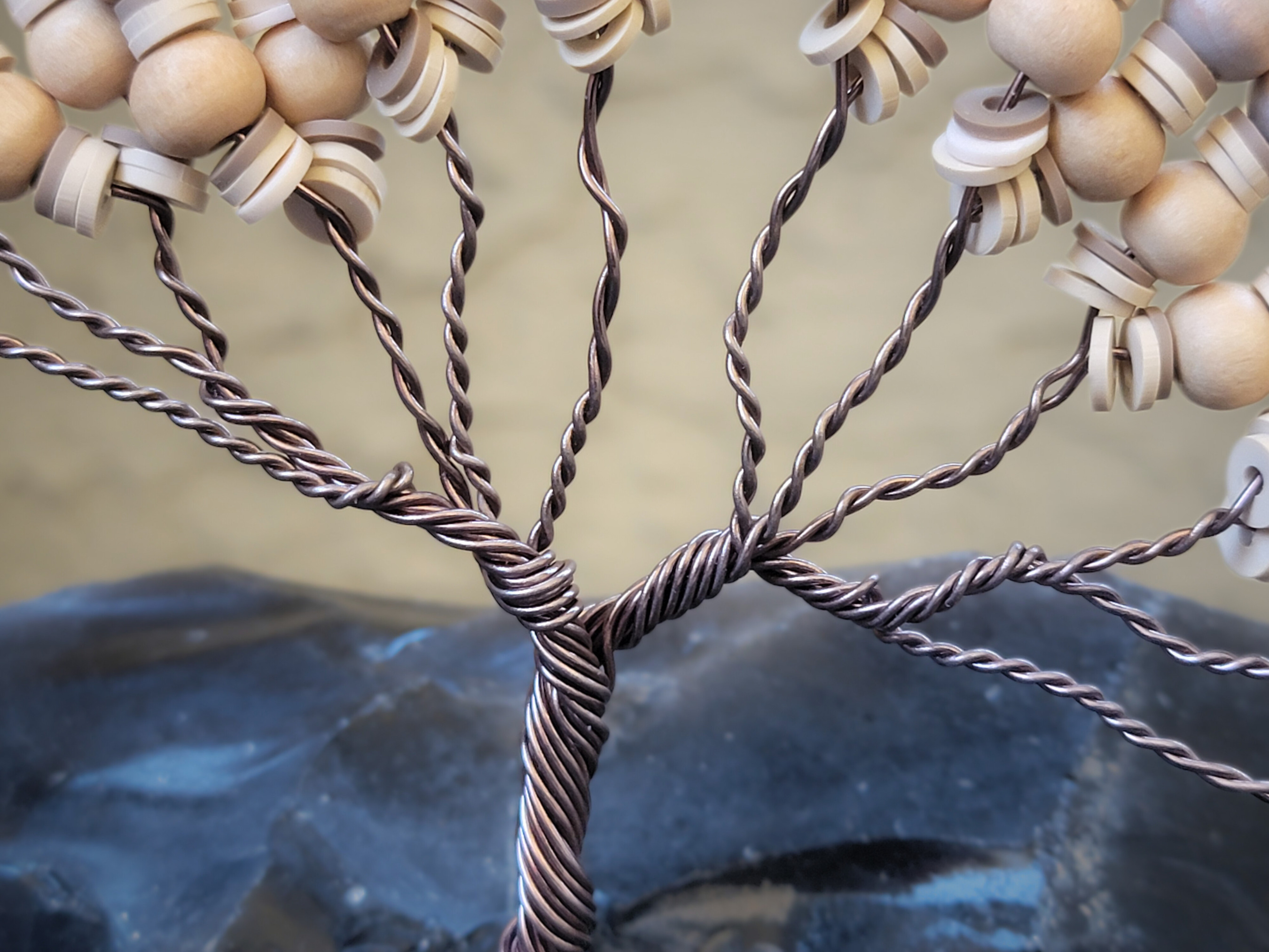 I begin by wrapping the hoop in my chosen material, then measure the wire to match the hoop. I anchor the roots down and from there, it’s a freestyle dance of twists and turns as the trunk and branches take shape.