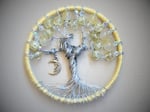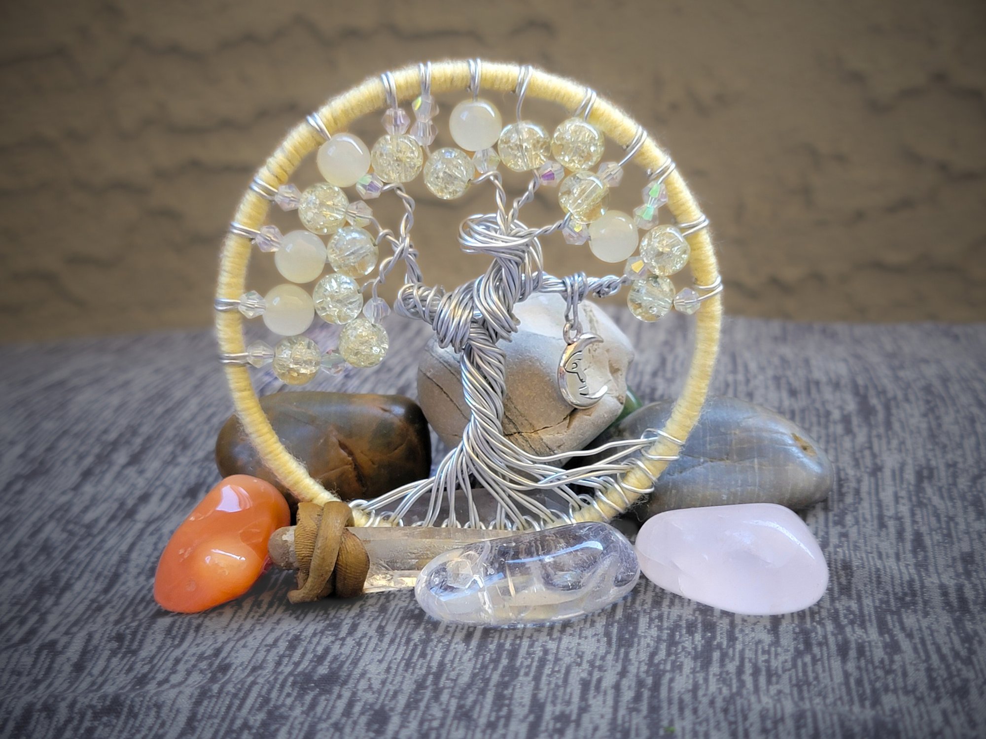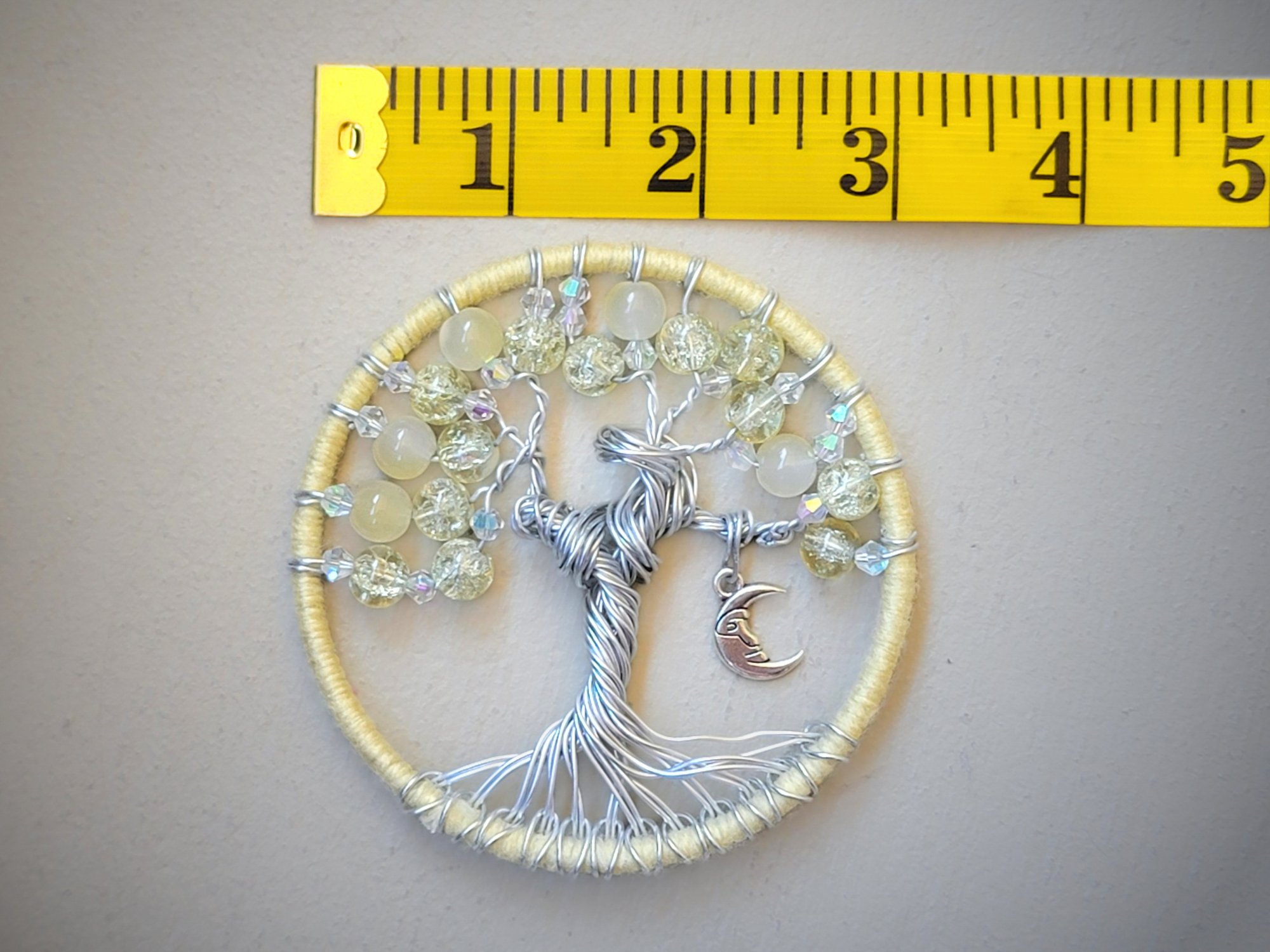 Bright and sunny vibes! This 3" Tree of Life features a chunky twisted wire trunk, a sweet little silver tone moon charm, and branches sprinkled with yellow and clear glass beads. Perfect for small spaces that need a splash of summer sunshine. Makes a cheerful wall accent or thoughtful gift!