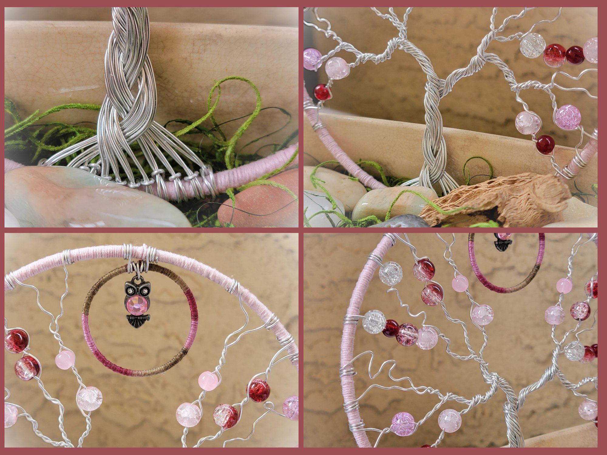 Wrapped in soft pink yarn, the hoop frames a delicate wire tree adorned with pink, cherry, and clear crackle glass beads that shimmer in the light. A charming owl accent adds a mystical touch, making this piece perfect for an indoor garden, window, or wall décor.